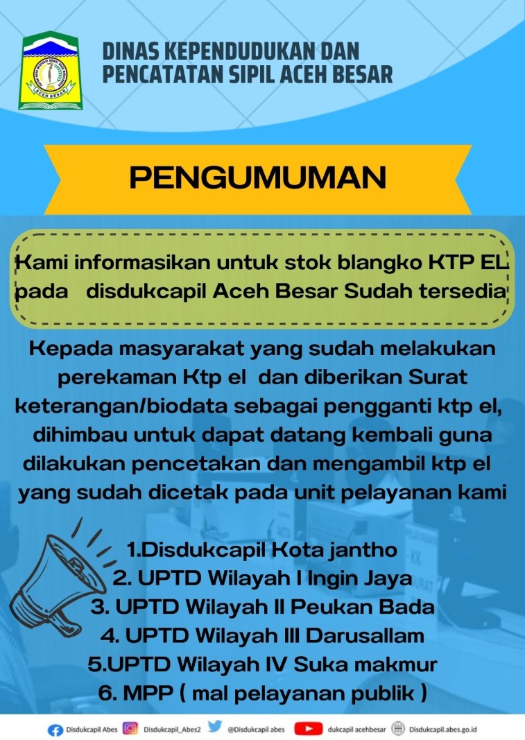“Jadi, kami himbau untuk dapat datang kembali, guna dilakukan pencetakan, baik itu ke kantor Disdukcapil kota jantho, UPTD wilayah I Ingin jaya, wilayah II Peukan Bada, wilayah III Darussalam, Wilayah IV Suka Makmur atau boleh juga langsung ke gedung Mal Pelayanan Publik yang ada di pasar lambaro Ingin Jaya,” katanya.