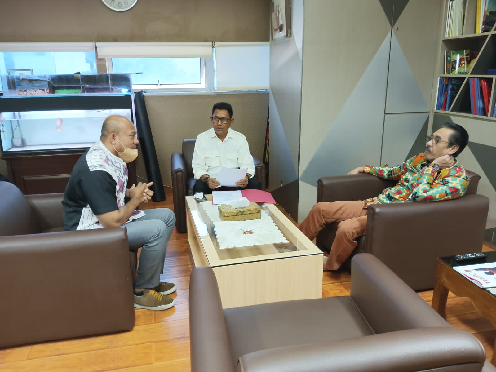 Kalaksa BPBD Aceh Besar, Ridwan Jamil, SSos, MSi, saat bersilaturrahmi dengan Direktur MPBK Kemendagri Drs Edy Suharmanto MSi sebelum menerima dokumen Berita Acara Serah Terima (BAST) 2 unit mobil pemadam kebakaran, diruang kerja Direktur MPBK, Bina Adwil Kemendagri, Kamis (6/4/2023). FOTO/ DOK BPBD ACEH BESAR