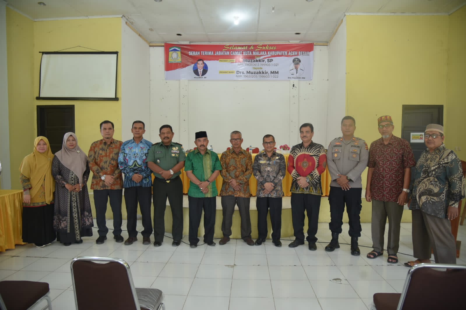 Asisten II Sekdakab Aceh Besar, Ali SSos, MSi, foto bersama pada usai serah terima jabatan camat Kuta Malaka, di aula Kantor Camat Kuta Malaka, Kamis (11/5/2023)FOTO/ MC ACEH BESAR