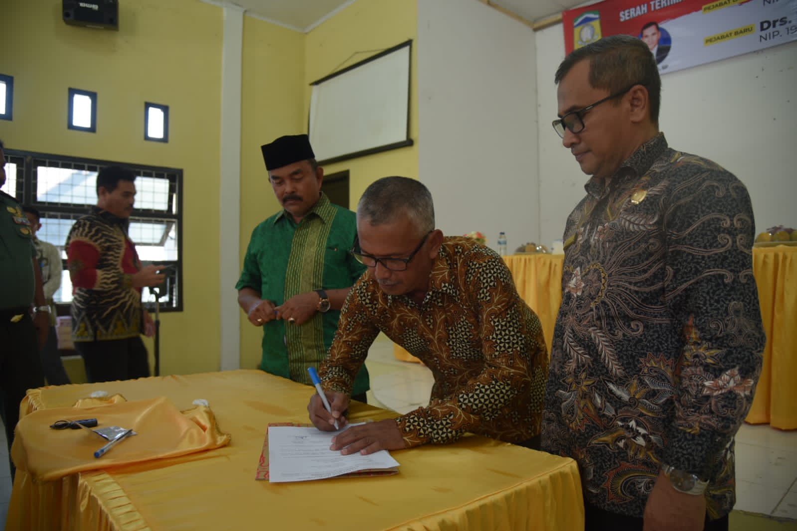 Asisten II Sekdakab Aceh Besar, M Ali SSos, MSi, menyaksikan penandatanganan serah terima jabatan camat Kuta Malaka, di Kantor Camat, Kuta Malaka, Kamis (11/5/2023)FOTO/ MC ACEH BESAR