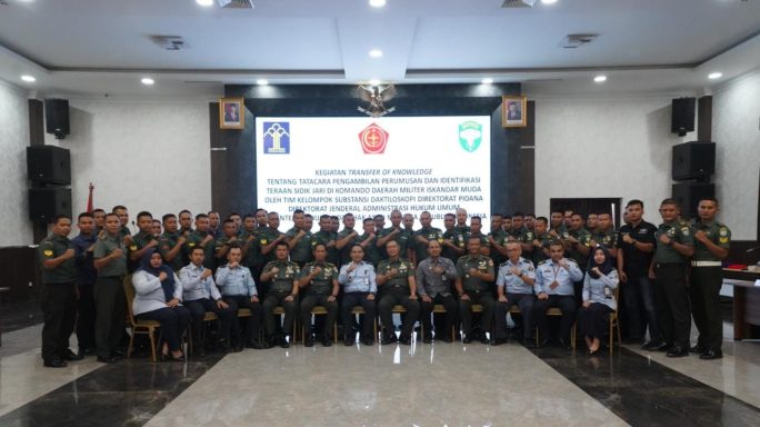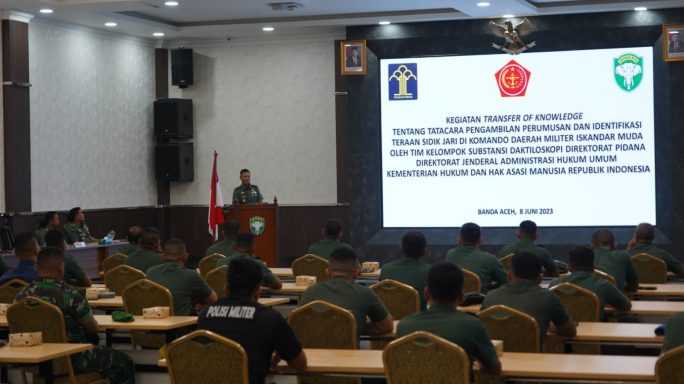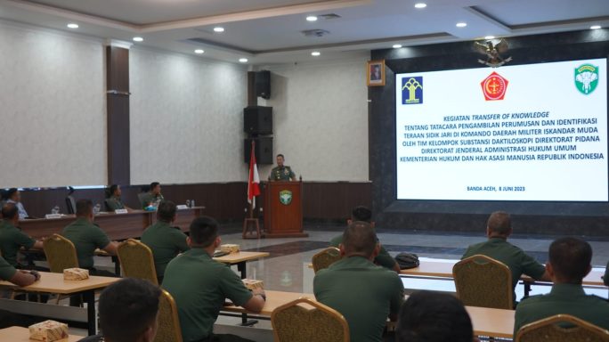 Banda Aceh – Direktur Ajudan Jenderal TNI Angkatan Darat (Dirajenad) Brigjen TNI Faisal Ahmadi, S.I.P., M.M., CHRMP., memimpin dan membuka sosialisasi kegiatan Transfer of Knowledge tentang Tata Cara Pengambilan Perumusan dan Identifikasi Teraan Sidik Jari di Kodam IM oleh Kelompok Subtansi Daktiloskopi Direktorat Pidana, Direktorat Jenderal Administrasi Hukum Umum Kemenkumham RI kepada para peserta sosialisasi bertempat di Aula Gedung Keumalahayati, Lantai II, Makodam IM pada hari Kamis (08/06/23).