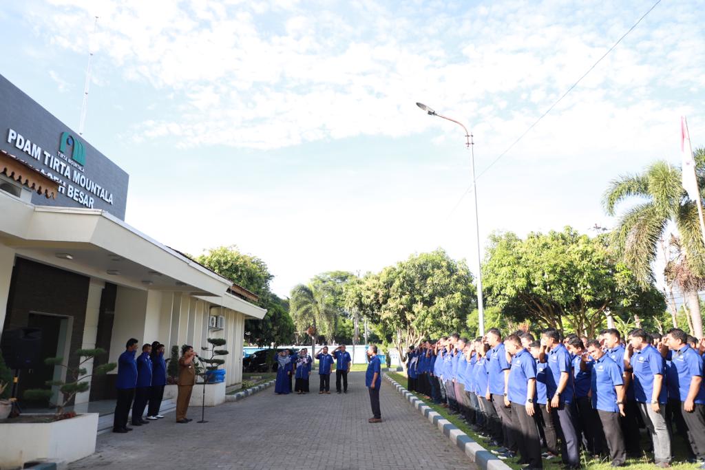 Direksi dan seluruh karyawan serta Karyawati saat mengikuti apel peringatan HUT ke 30 PDAM Tirta Mountala, Aceh Besar, di Halaman Kantor PDAM, Gampong Siron, Kecamatan Ingin Jaya, Selasa (13/6/2023).FOTO/ PROKOPIM PEMKAB ACEH BESAR