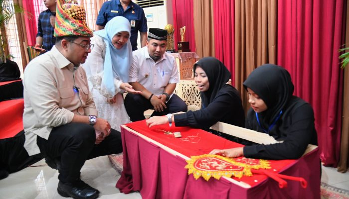 Pj Bupati Aceh Besar Muhammad Iswanto, S.STP MM dan Pj Ketua TP PKK Aceh Besar Cut Rezky Handayani SIP MM dampingi Menteri Ekonomi Kreatif RI, Teuku Riefky Harsya melihat batik sulaman khas Aceh Besar di Gedung Dekranasda, Gampong Gani, Kecamatan Ingin Jaya, Aceh Besar, Jumat (15/11/2024).FOTO/ BEDU SAINI