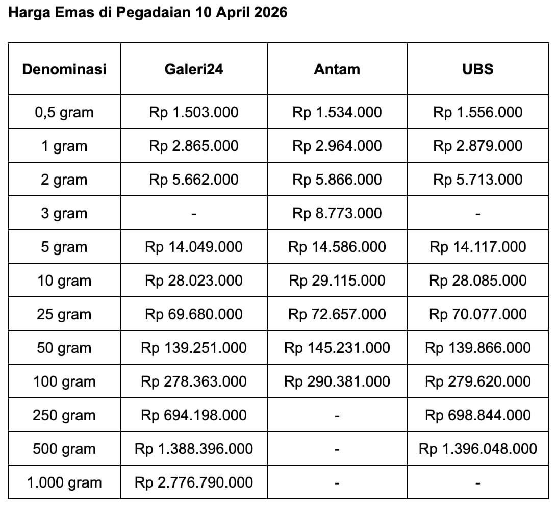 Pada Jumat (10/4/2026), seperti dikutip dari situs Sahabat Pegadaian, harga emas batangan cetakan PT Aneka Tambang (Persero) Tbk (ANTM) di Pegadaian adalah Rp 1.534.000. Turun Rp 26.000 dibandingkan hari sebelumnya.