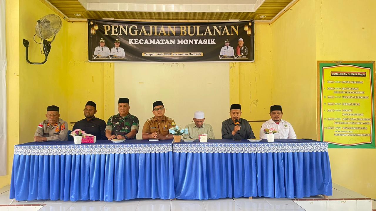 oketrend.id, Kota Jantho — Aparatur pemerintahan se-Kecamatan Montasik kembali mengikuti pengajian rutin yang digelar di UDKP Kantor Camat Montasik, Selasa (14/4/2026). Pengajian ini menjadi momentum memperkuat nilai keagamaan sekaligus mempererat silaturahmi antar unsur pemerintahan dan masyarakat.